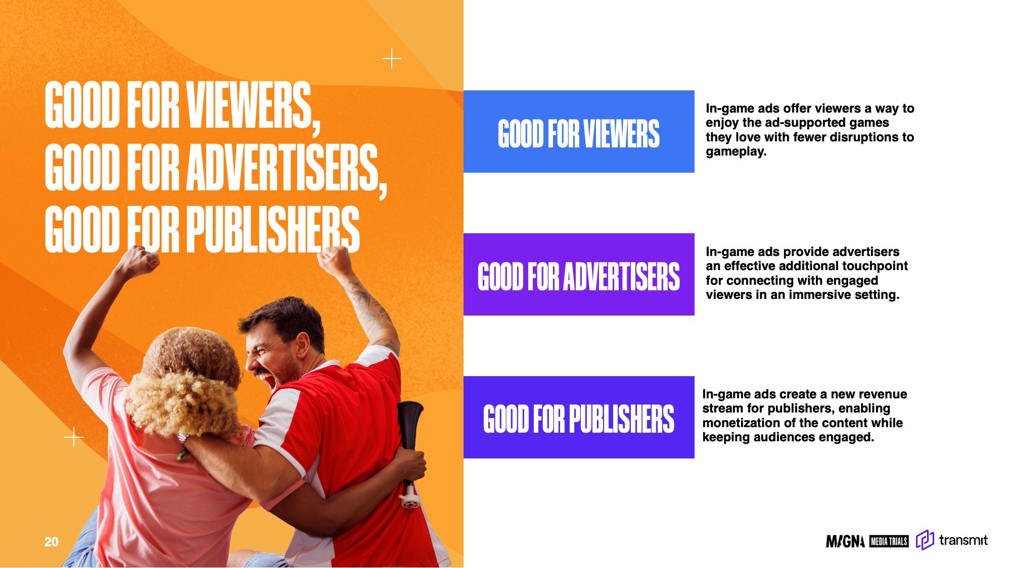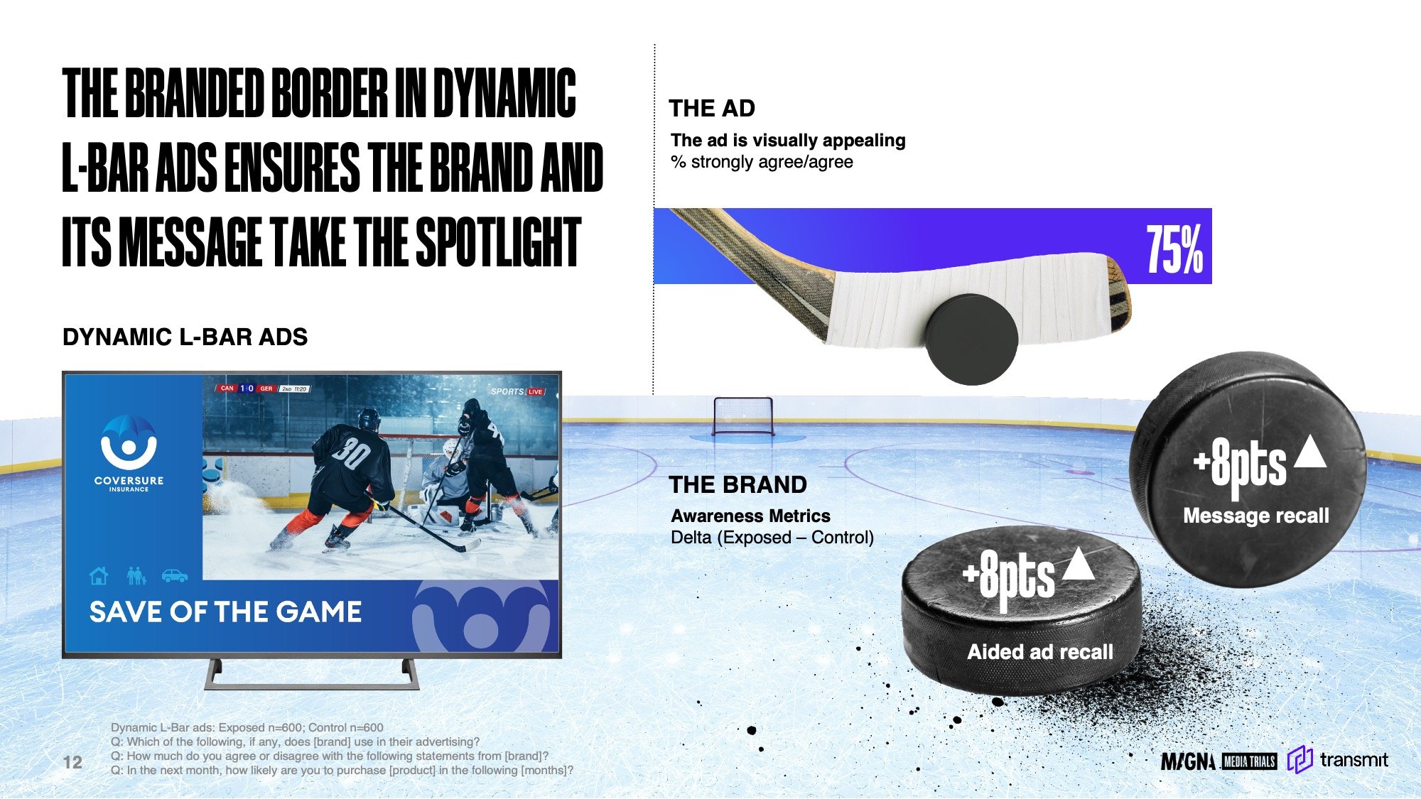 Transmit, in partnership with MAGNA Global Media Trials, has explored how brands can create unforgettable advertising experiences within the context of live sports streaming. Working closely with Magna Media Trials, I led the visual development of the deck from concept to execution. I began by creating a moodboard to establish tone and direction, then transformed their data and insights into eye-catching visuals that reinforced the story and highlighted key outcomes.